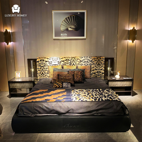 Juego de dormitorio italiano de lujo moderno, muebles, cama doble bordada de gama alta, cabecero de tigre grande, cama tapizada tamaño King